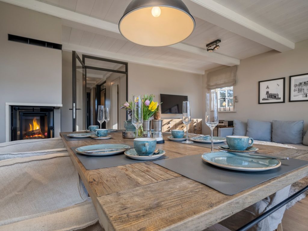 Im Erdgeschoss ist vom Flur aus die geschlossene Küche mit kleinem Essbereich und das separate Wohn- und Esszimmer begehbar. Die moderne und hochwertig ausgestattete Küche lässt mit Induktionsherd und integrierter Dunstabzugshaube, Mikrowelle mit Backofen-Funktion, Weinkühlschrank, Nespresso-Kapselmaschine und SodaStream Wassersprudler keine Wünsche offen. Ein gemütlicher Wohnraum mit freiem Blick in den Garten verfügt über einen Sofa- und Essbereich, die mit Kamin und TV zum Verweilen einladen.