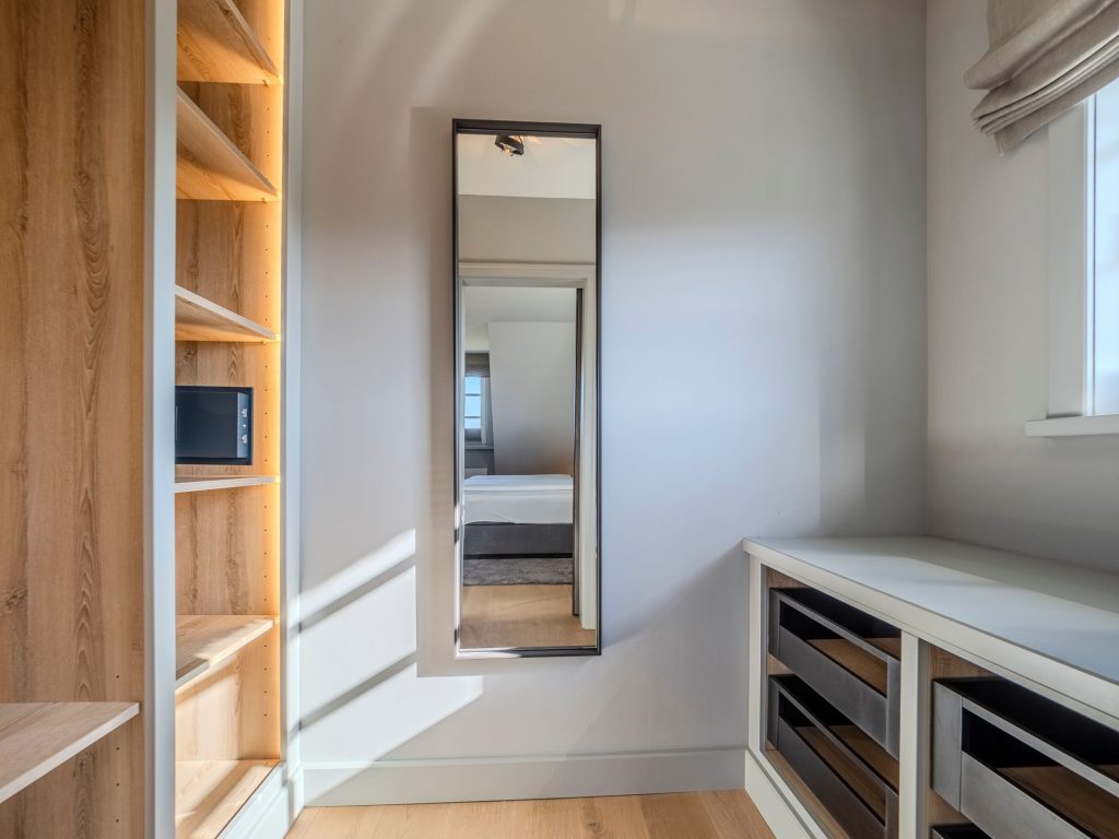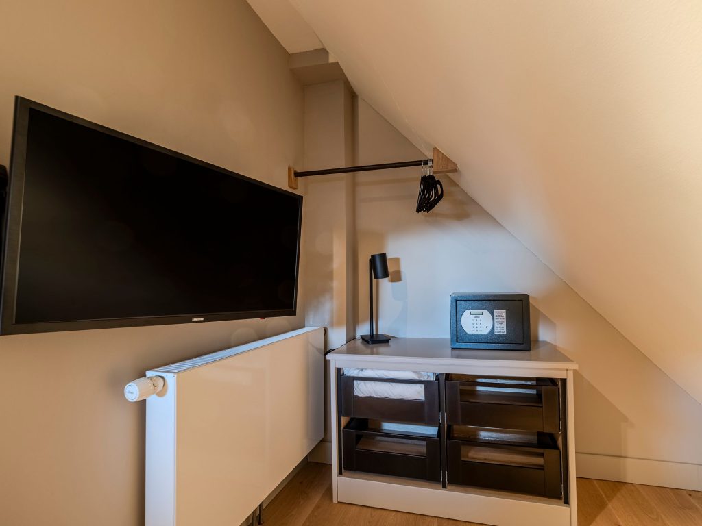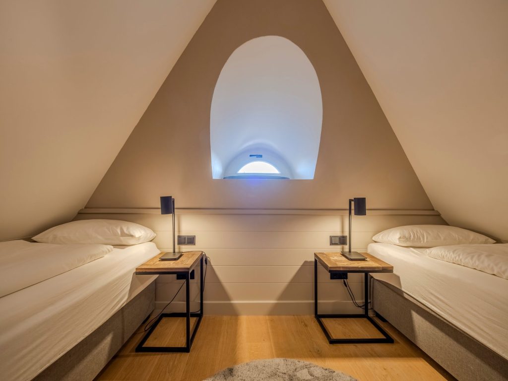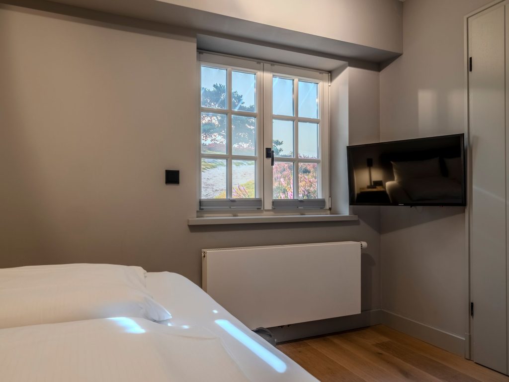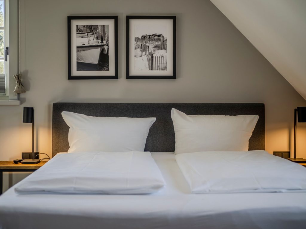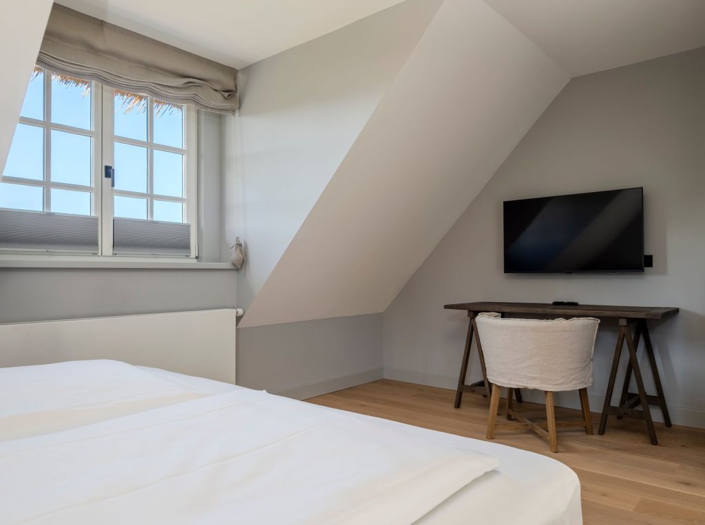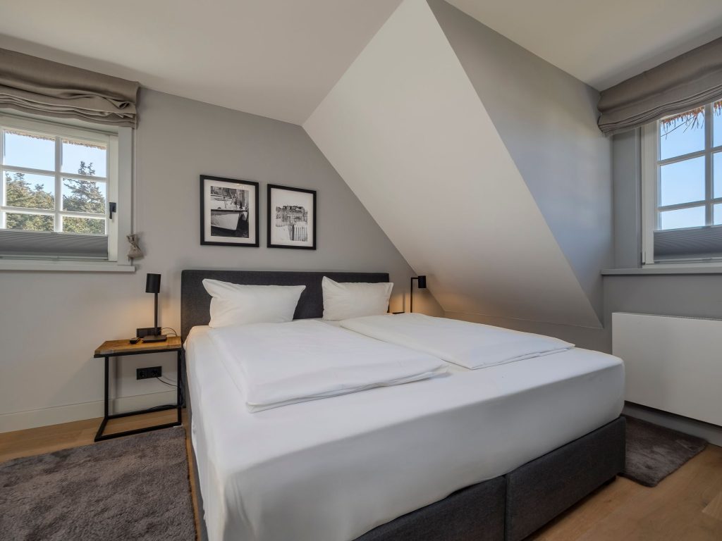 Zwei Doppelschlafzimmer und ein Schlafzimmer mit zwei Einzelbetten (80 cm x 200 cm unter der Dachschrägen - steile Treppe), die sich auch mittig zusammenstellen lassen. Alle Schlafzimmer verfügen über ein TV-Gerät, Hotelsafe, Verdunkelungsmöglichkeiten für die Fenster und Stauraum in Form von Kommoden, Garderoben oder Einbauschränken für Kleidung und persönliche Dinge. Das größte Schlafzimmer bietet einen kleinen Schreibbereich, der auch mobiles Arbeiten im Urlaub ermöglicht, einen begehbaren Kleiderschrank und Meerblick.