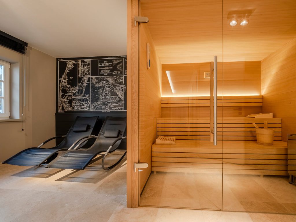 Großzügige Sauna mit schönem Ruhebereich und zwei Liegemöglichkeiten.