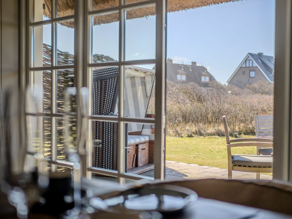 Vom Wohn- und Esszimmer gelangen Sie auf die möblierte Südterrasse mit Ganzjahresstrandkorb und können das Meeresrauschen der Nordsee hören. Eine kleine Erhebung im Garten ermöglicht den Blick über die Dünen auf die Nordsee.