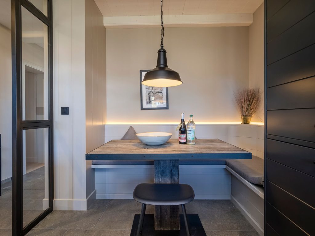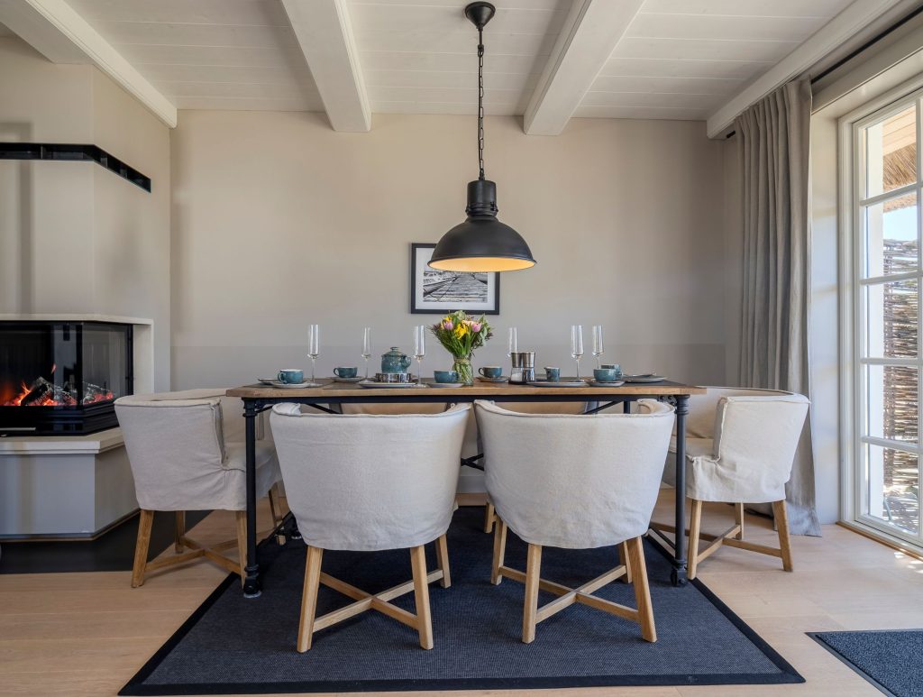 Im Erdgeschoss ist vom Flur aus die geschlossene Küche mit kleinem Essbereich und das separate Wohn- und Esszimmer begehbar. Die moderne und hochwertig ausgestattete Küche lässt mit Induktionsherd und integrierter Dunstabzugshaube, Mikrowelle mit Backofen-Funktion, Weinkühlschrank, Nespresso-Kapselmaschine und SodaStream Wassersprudler keine Wünsche offen. Ein gemütlicher Wohnraum mit freiem Blick in den Garten verfügt über einen Sofa- und Essbereich, die mit Kamin und TV zum Verweilen einladen.