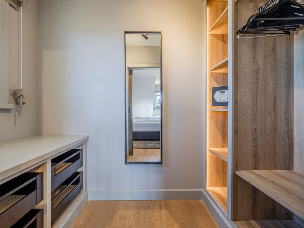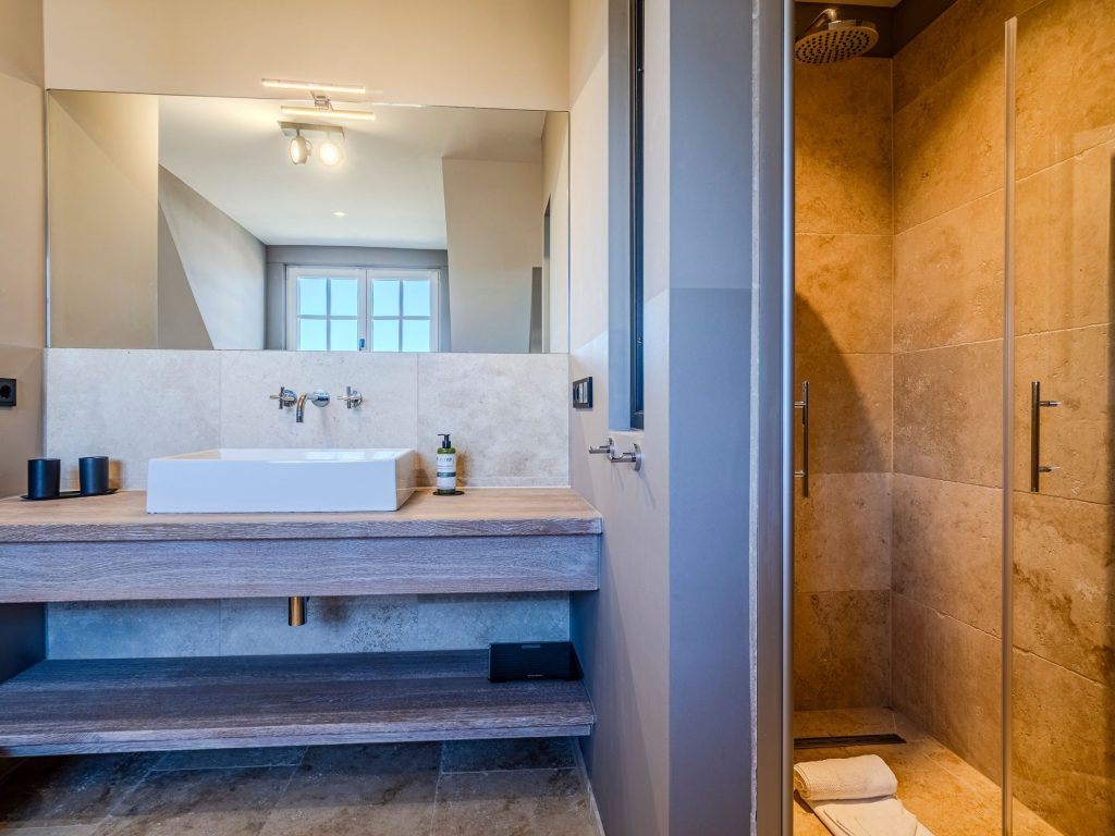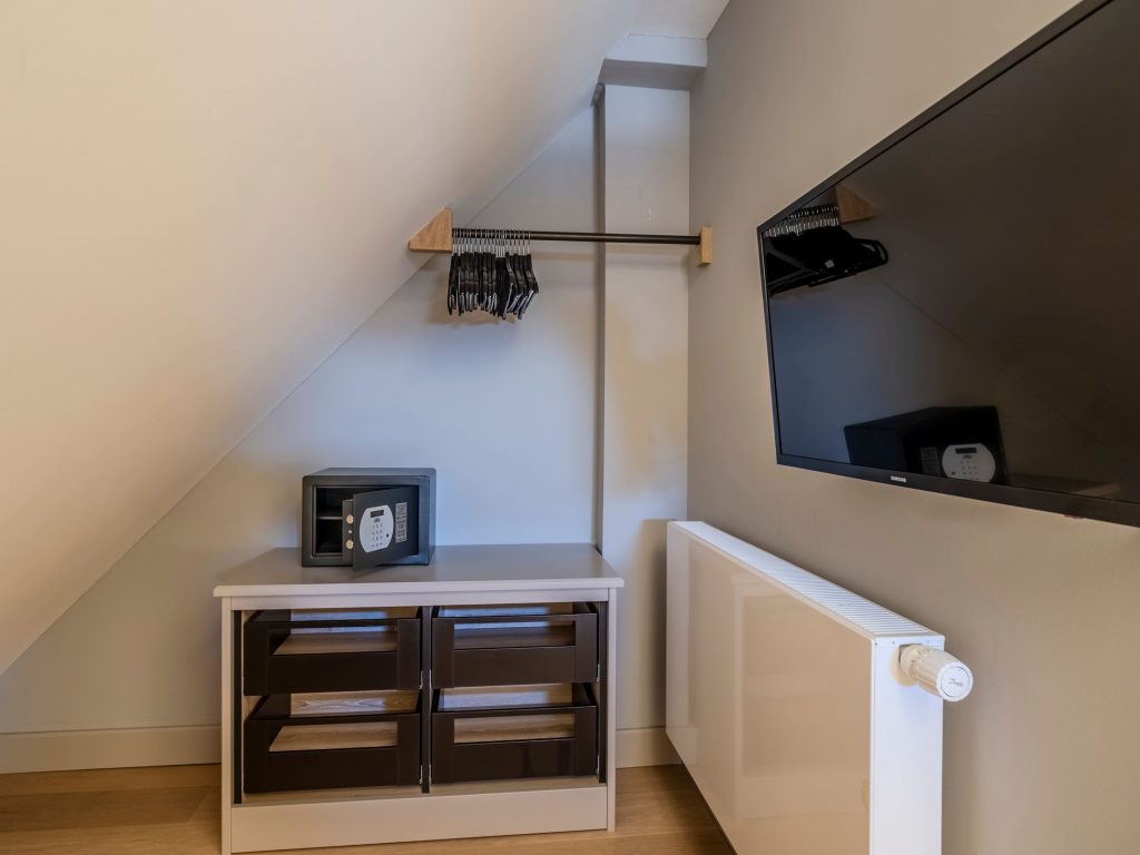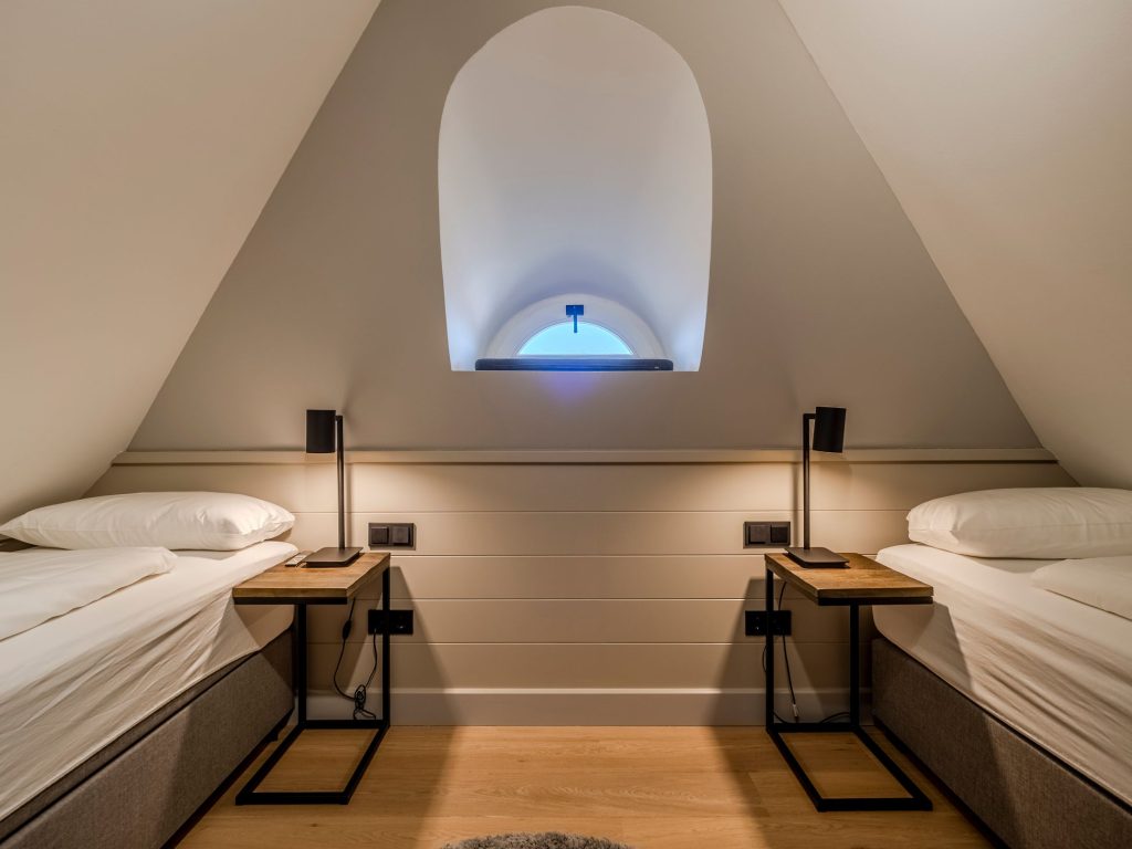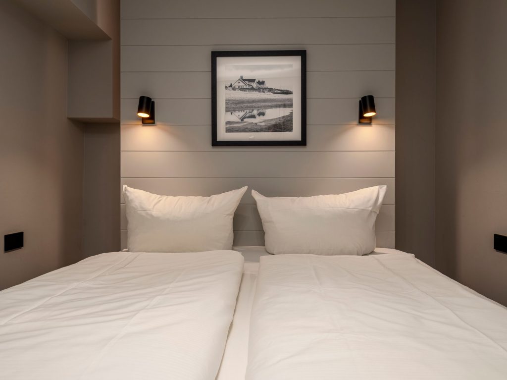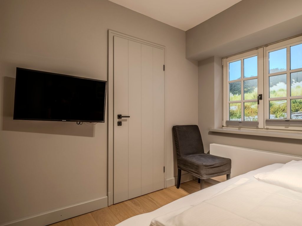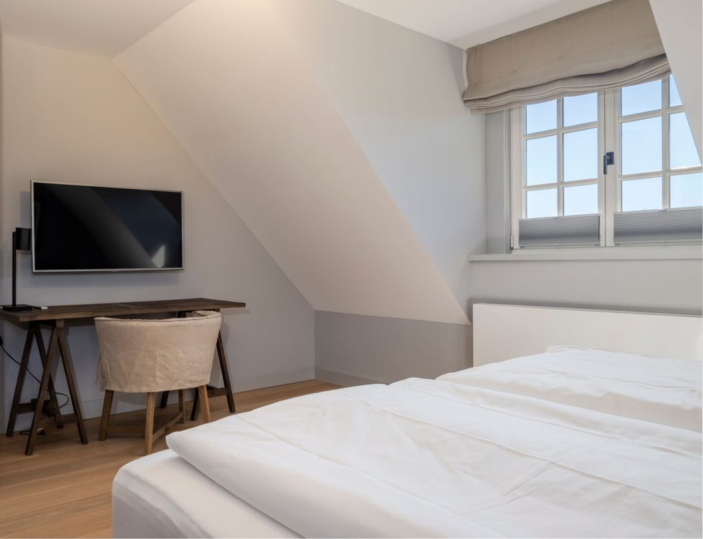 Zwei Doppelschlafzimmer und ein Schlafzimmer mit zwei Einzelbetten (80 cm x 200 cm/unter Dachschrägen - steile Treppe), die sich auch mittig zusammenstellen lassen. Alle Schlafzimmer verfügen über ein TV-Gerät, Hotelsafe, Verdunkelungsmöglichkeiten für die Fenster und Stauraum in Form von Kommoden, Garderoben oder Einbauschränken für Kleidung und persönliche Dinge. Das größte Schlafzimmer bietet einen kleinen Schreibbereich, der auch mobiles Arbeiten im Urlaub ermöglicht, einen begehbaren Kleiderschrank und Meerblick.