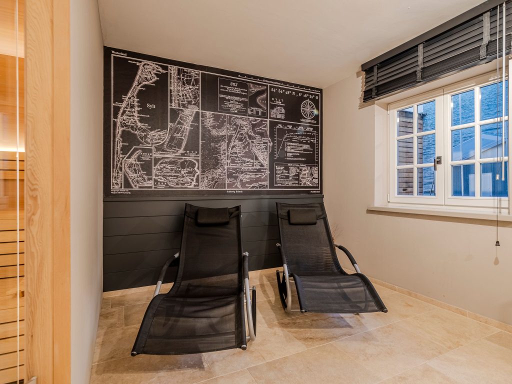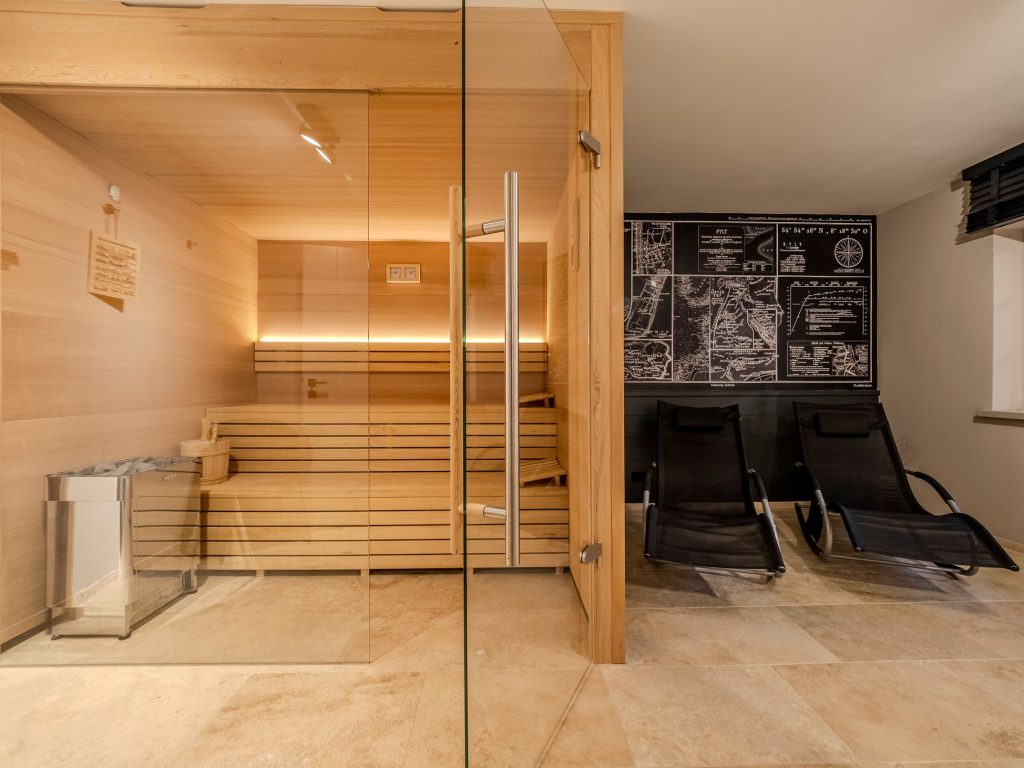 Großzügige Sauna mit schönem Ruhebereich und zwei Liegemöglichkeiten.
