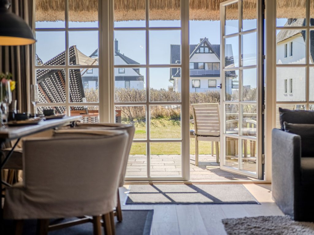 Dieses großzügige Luxus-Hausteil unter Reet befindet sich auf einem traumhaften Grundstück in unmittelbarer Strandnähe in Wenningstedt. Das Feriendomizil wurde zuletzt im Jahr 2022 aufwendig saniert und liebevoll mit wertvollen Materialien und hochwertigen Möbeln eingerichtet.