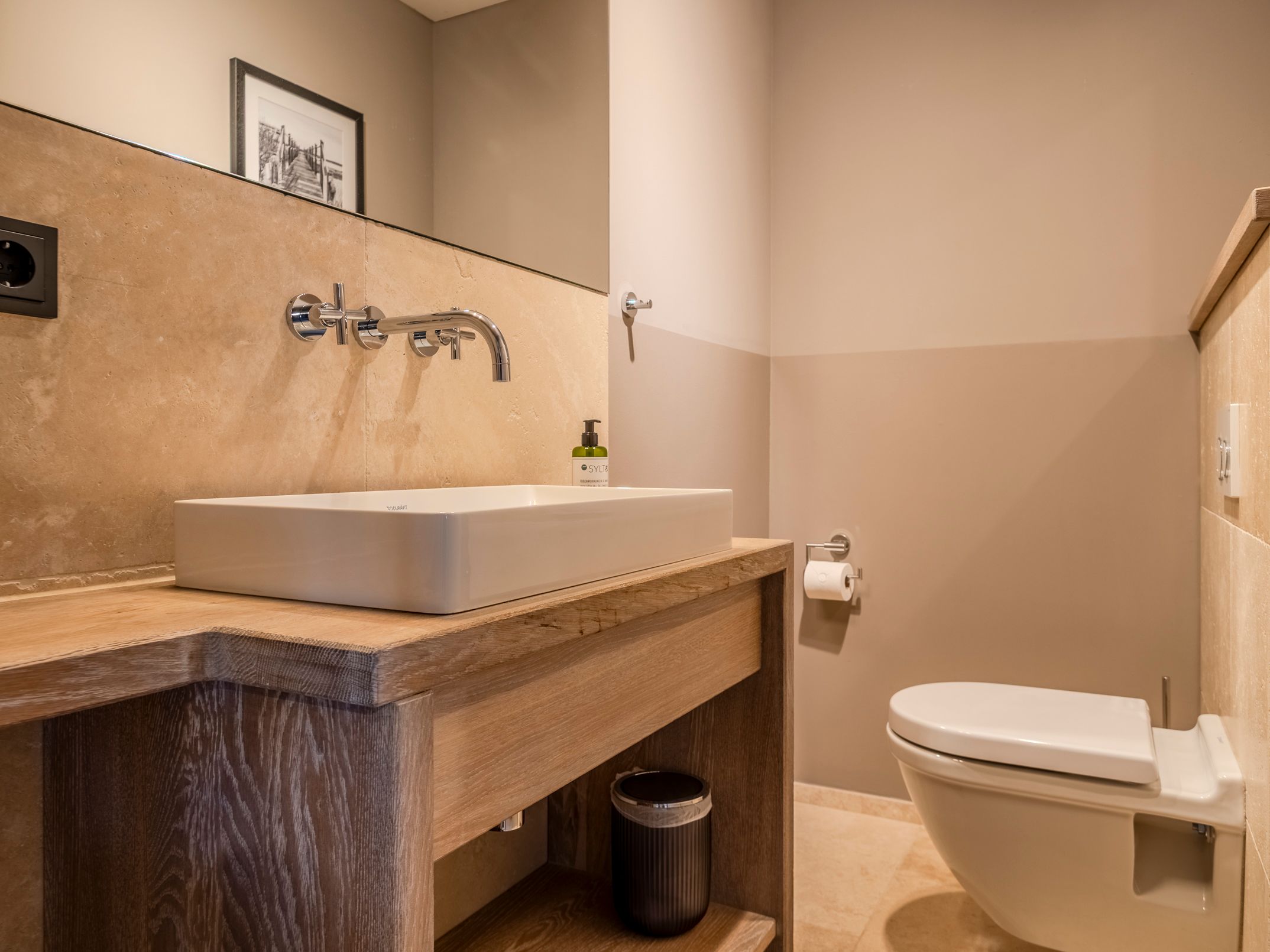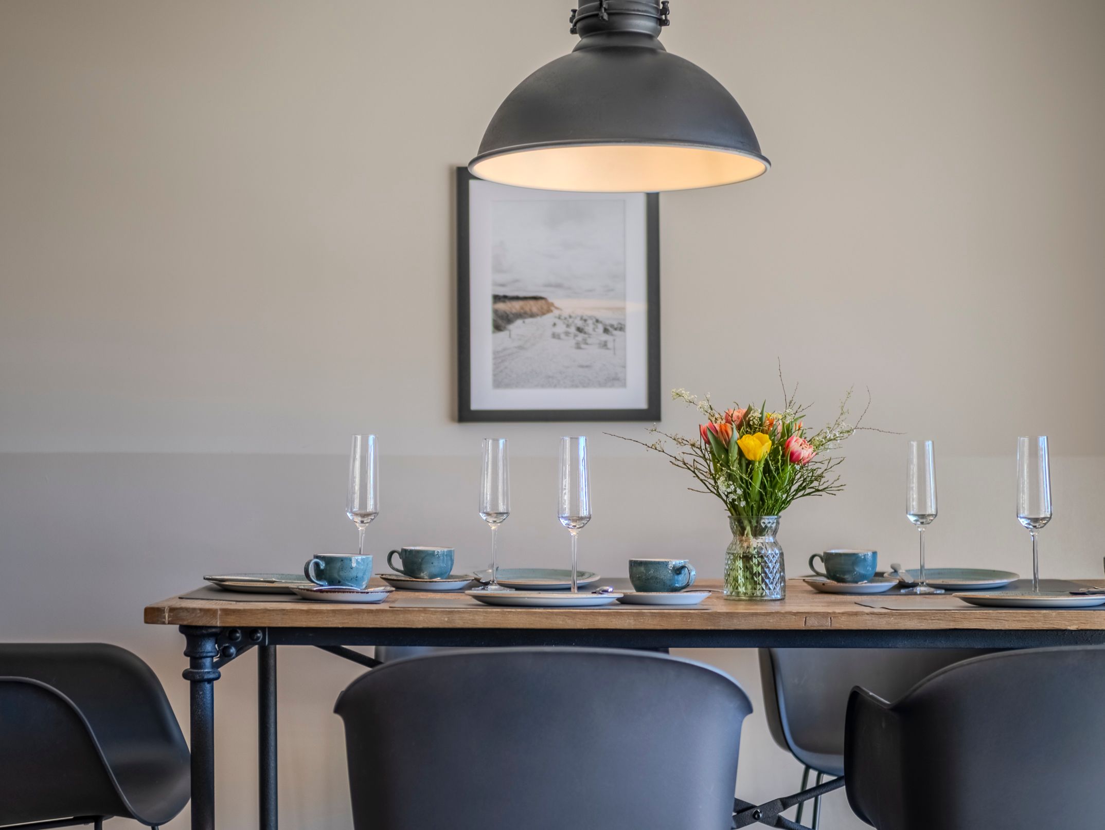 Im Erdgeschoss ist vom Flur aus die geschlossene Küche mit kleinem Essbereich und das separate Wohn- und Esszimmer begehbar. Die moderne und hochwertig ausgestattete Küche lässt mit Induktionsherd und integrierter Dunstabzugshaube, Mikrowelle mit Backofen-Funktion, Weinkühlschrank, Nespresso-Kapselmaschine und SodaStream Wassersprudler keine Wünsche offen. Ein gemütlicher Wohnraum mit freiem Blick in den Garten verfügt über einen Sofa- und Essbereich, die mit Kamin und TV zum Verweilen einladen.