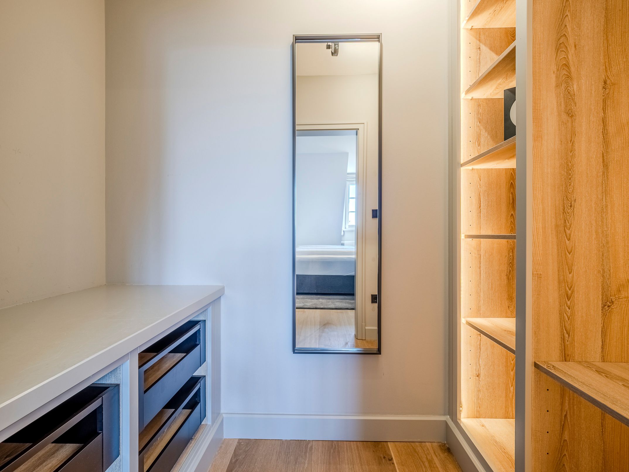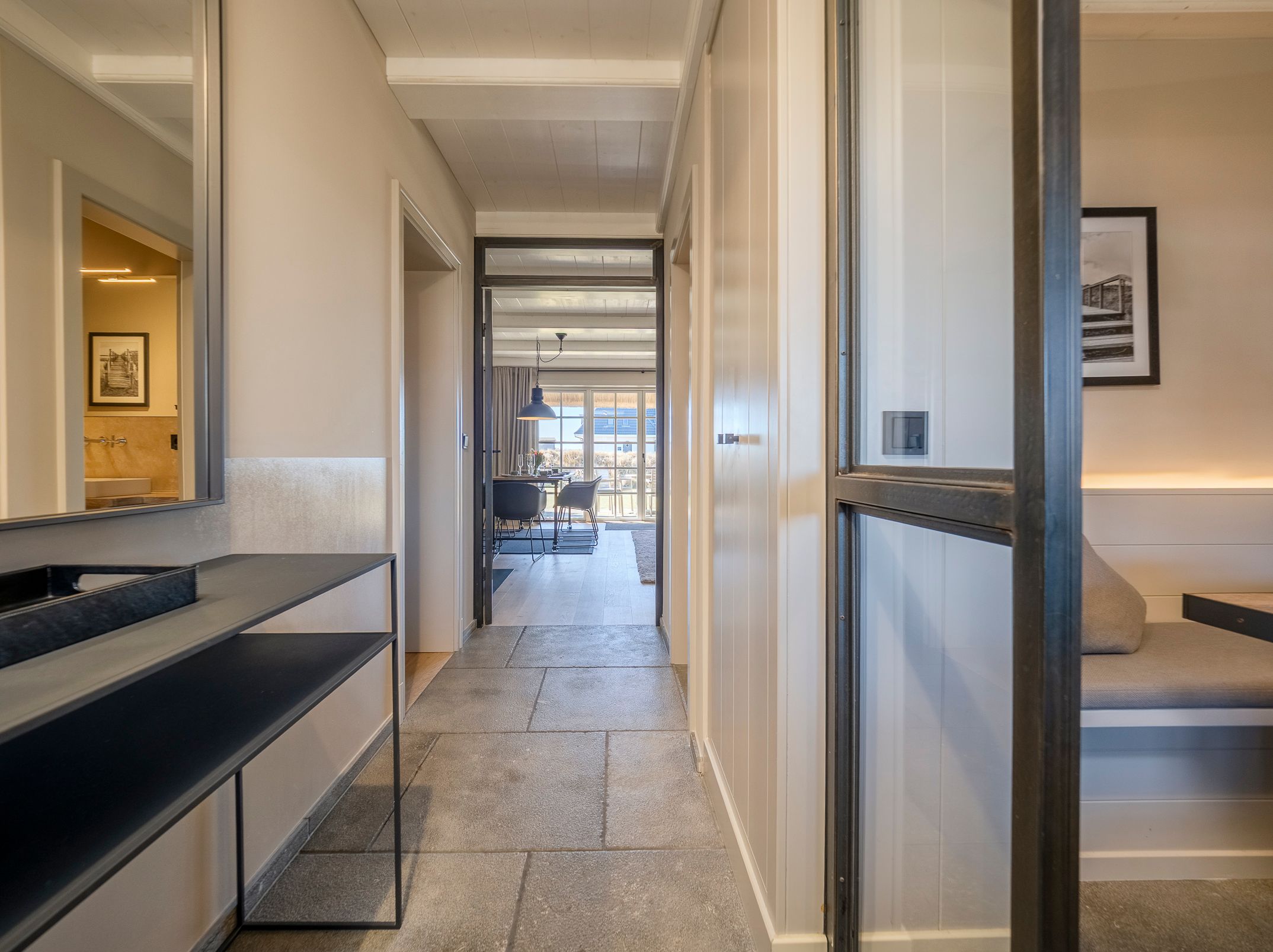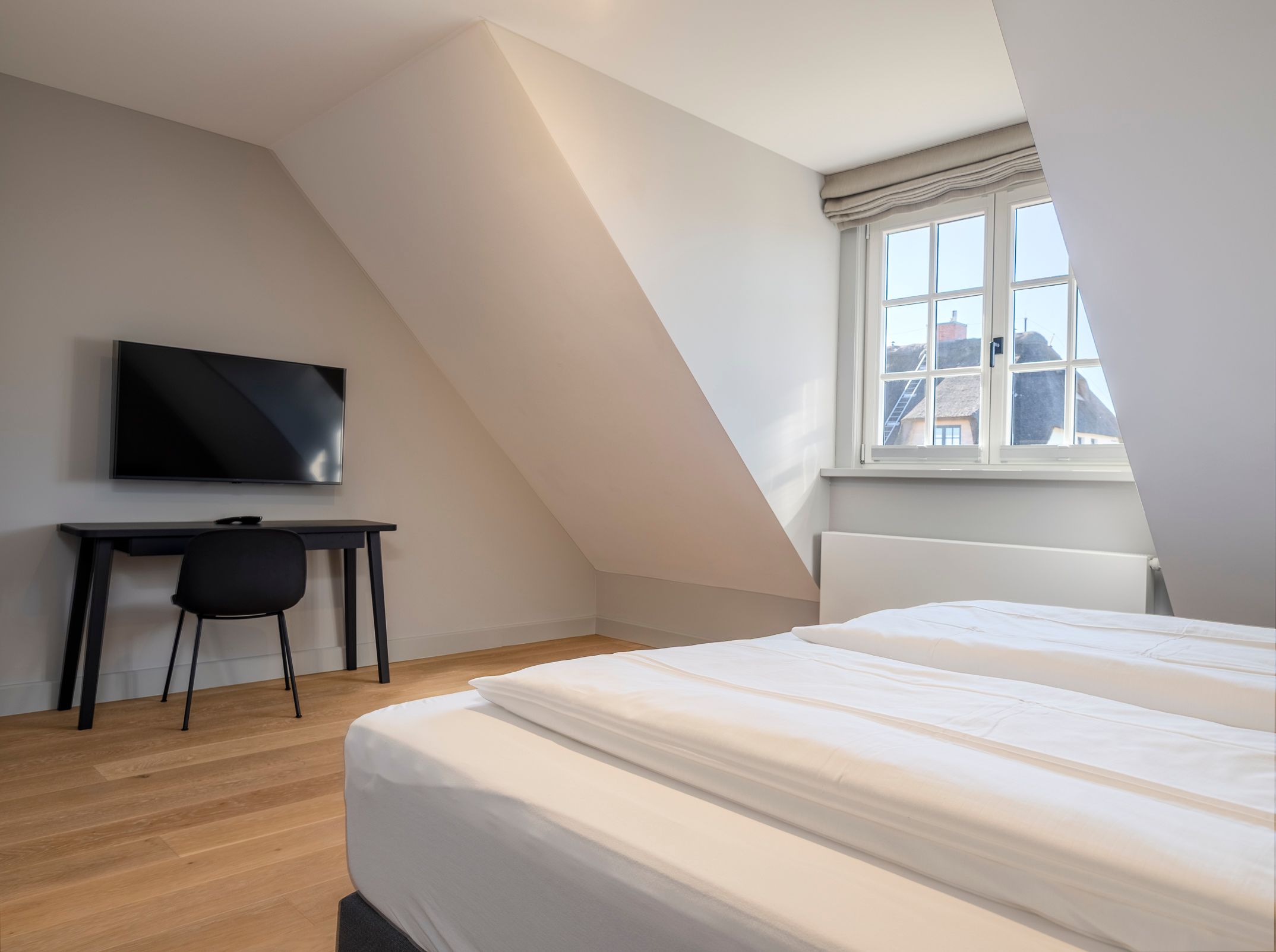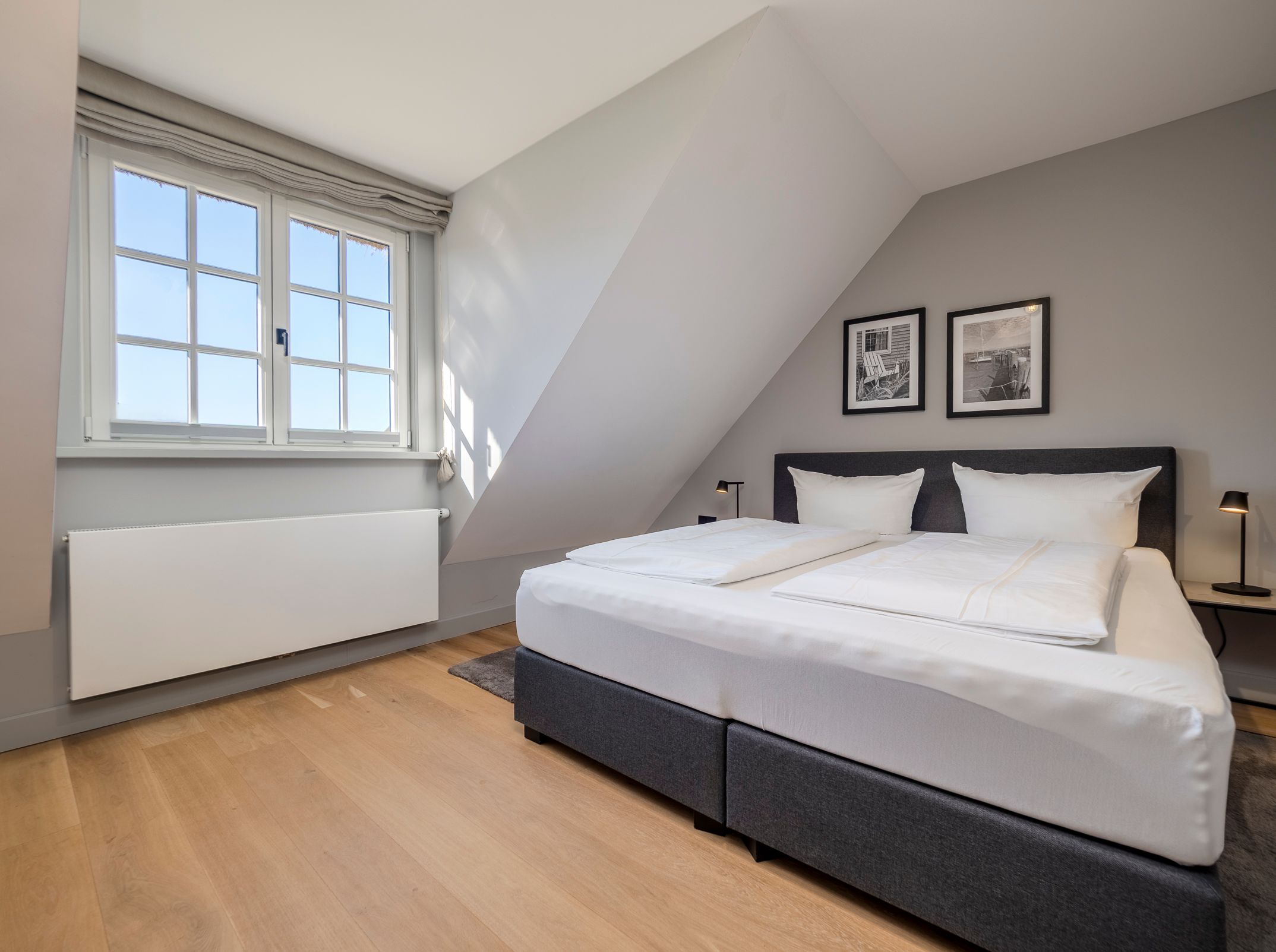 Zwei Doppelschlafzimmer, die beide über ein TV-Gerät, Hotelsafe, Verdunkelungsmöglichkeiten für die Fenster und Stauraum in Form von Kommoden, Garderoben oder Einbauschränken für Kleidung und persönliche Dinge verfügen. Das größere Schlafzimmer bietet einen kleinen Schreibbereich, der auch mobiles Arbeiten im Urlaub ermöglicht, einen begehbaren Kleiderschrank und Meerblick.