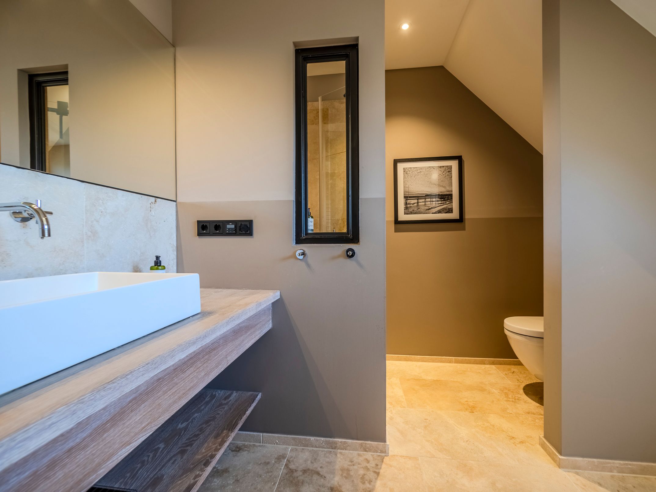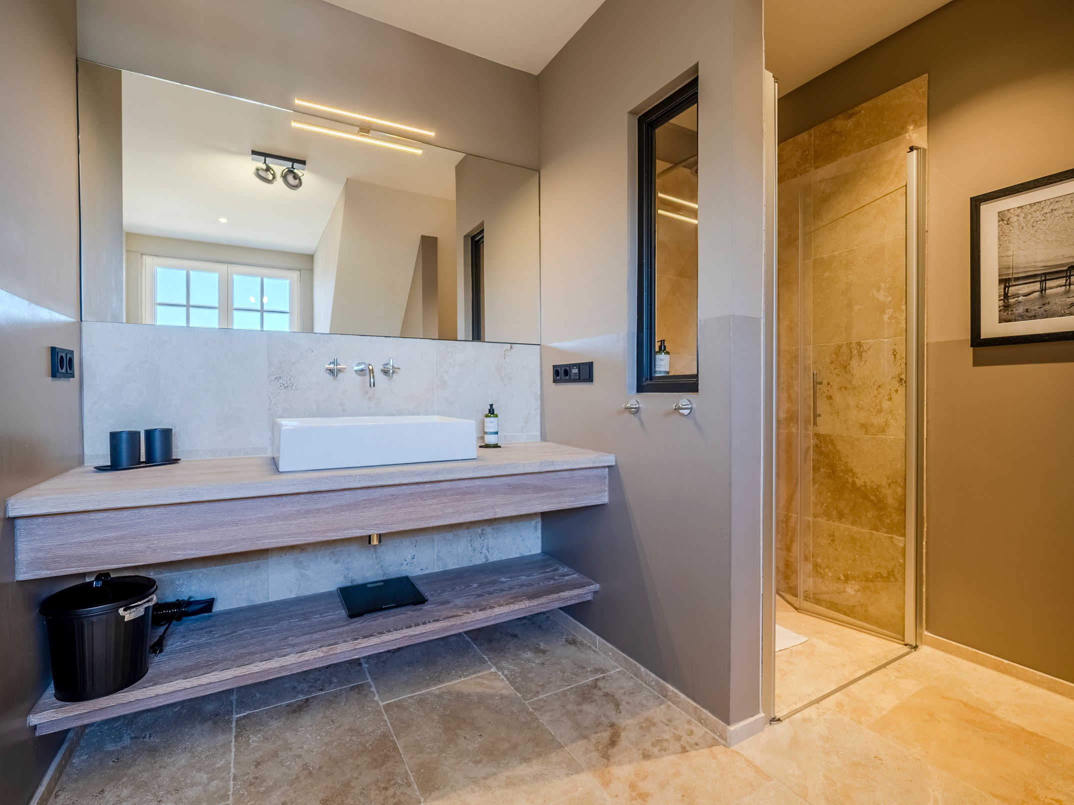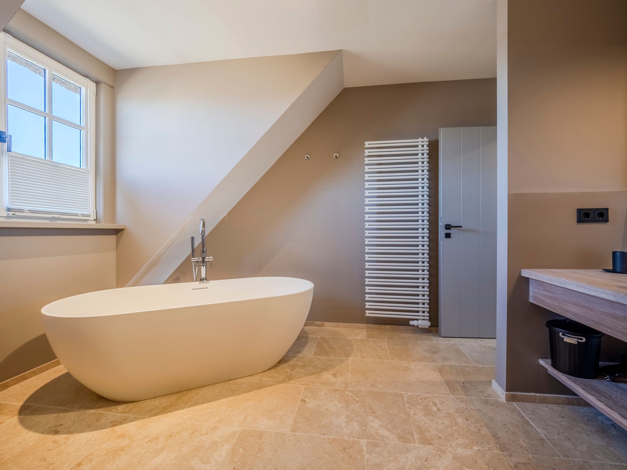 Zwei Badezimmer mit bodengleicher Regendusche, Handtuchtrockner. Eines der Badezimmer verfügt zusätzlich über eine freistehende Badewanne, Radio und Meerblick.