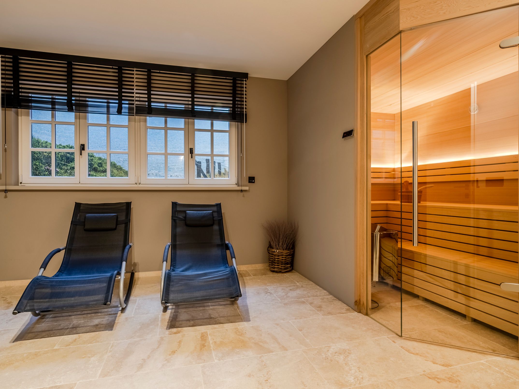 Großzügige Sauna mit schönem Ruhebereich und zwei Liegemöglichkeiten.