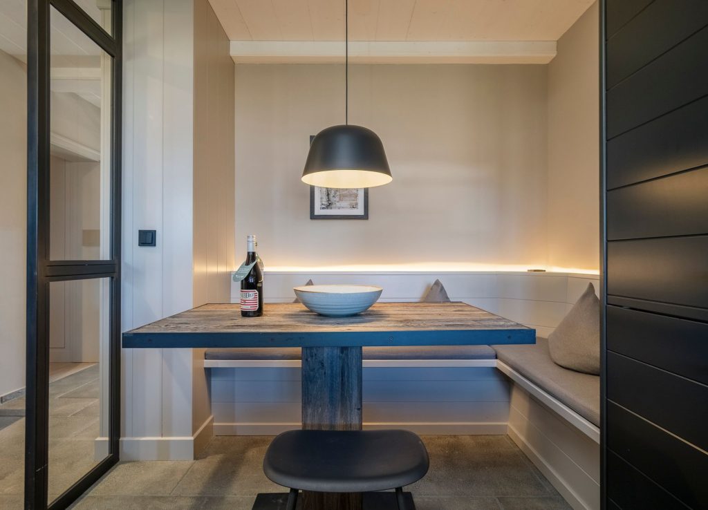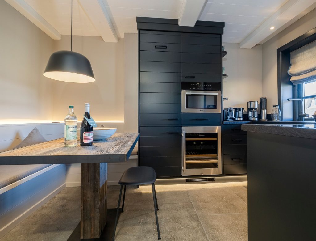 Im Erdgeschoss ist vom Flur aus die geschlossene Küche mit kleinem Essbereich und das separate Wohn- und Esszimmer begehbar. Die moderne und hochwertig ausgestattete Küche lässt mit Induktionsherd und integrierter Dunstabzugshaube, Mikrowelle mit Backofen-Funktion, Weinkühlschrank, Nespresso-Kapselmaschine und SodaStream Wassersprudler keine Wünsche offen. Ein gemütlicher Wohnraum mit freiem Blick in den Garten verfügt über einen Sofa- und Essbereich, die mit Kamin und TV zum Verweilen einladen.
