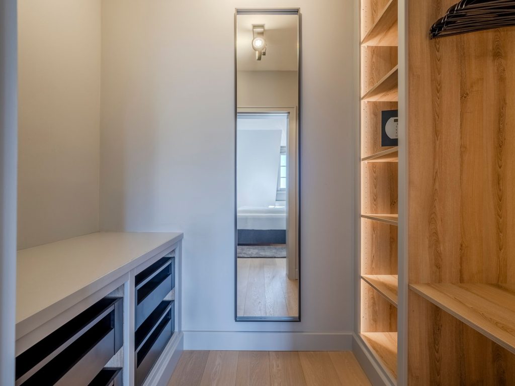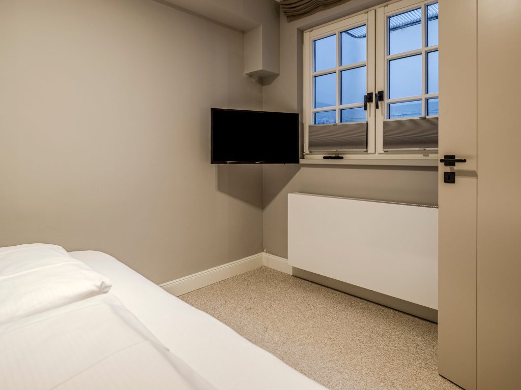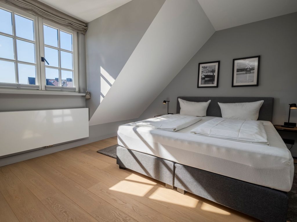 Zwei Doppelschlafzimmer, die beide über ein TV-Gerät, Hotelsafe, Verdunkelungsmöglichkeiten für die Fenster und Stauraum in Form von Kommoden, Garderoben oder Einbauschränken für Kleidung und persönliche Dinge verfügen. Das größere Schlafzimmer bietet einen kleinen Schreibbereich, der auch mobiles Arbeiten im Urlaub ermöglicht, einen begehbaren Kleiderschrank und Meerblick.