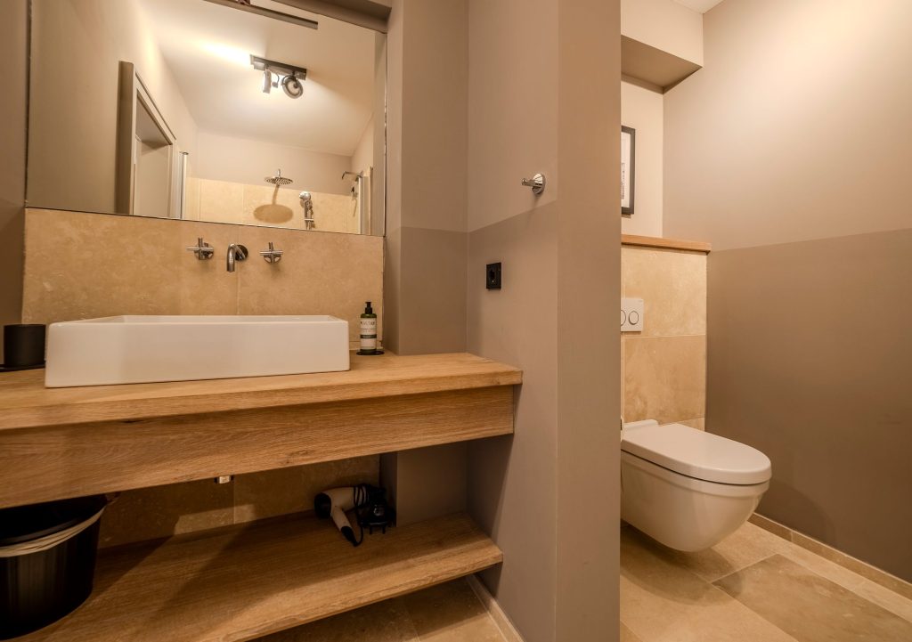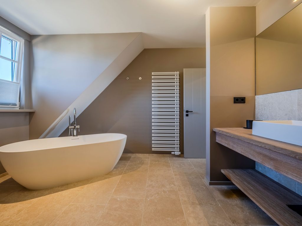 Zwei Badezimmer mit bodengleicher Regendusche, Handtuchtrockner. Eines der Badezimmer verfügt zusätzlich über eine freistehende Badewanne, Radio und Meerblick.