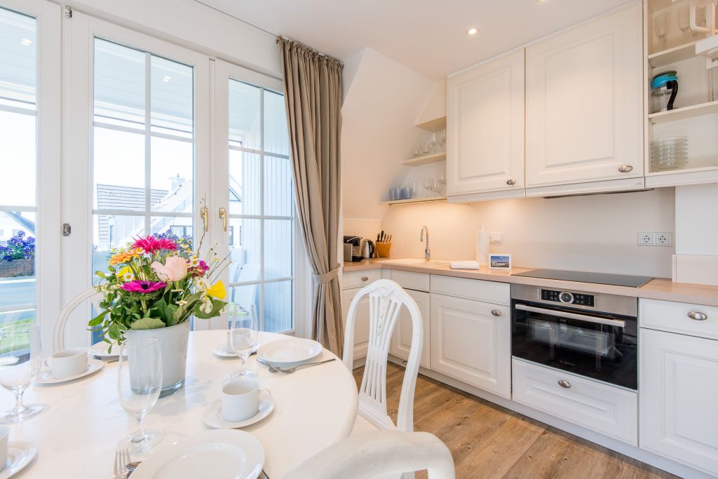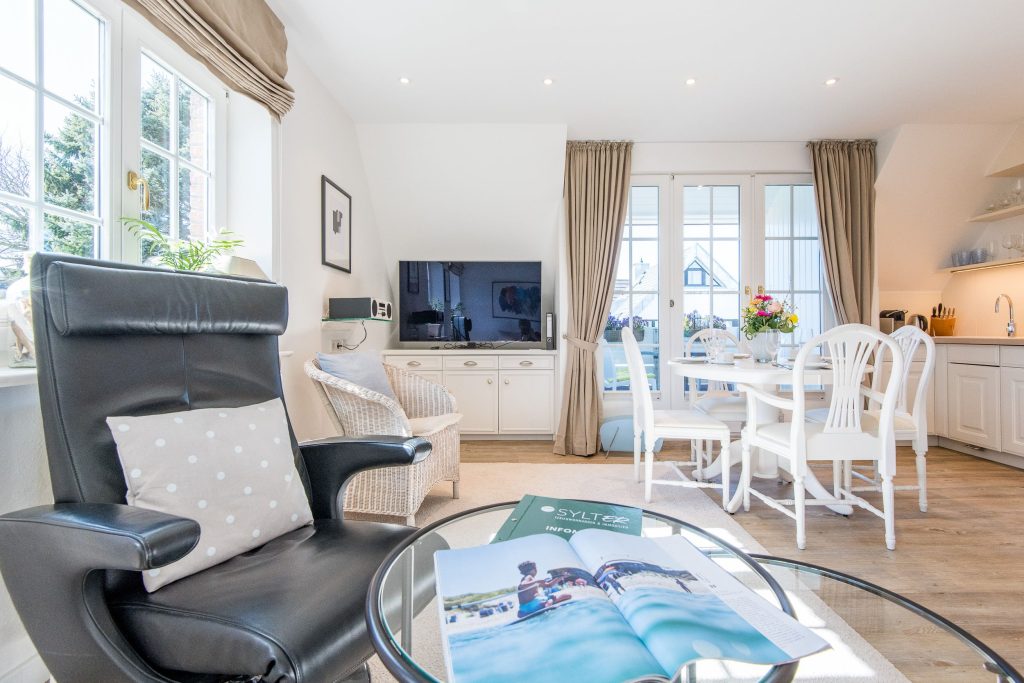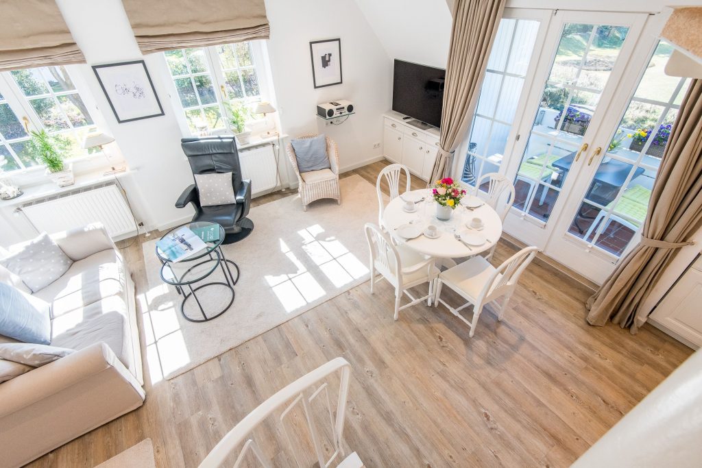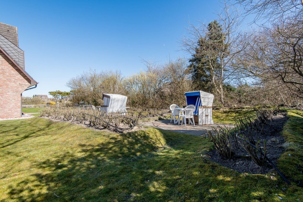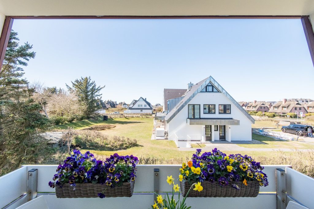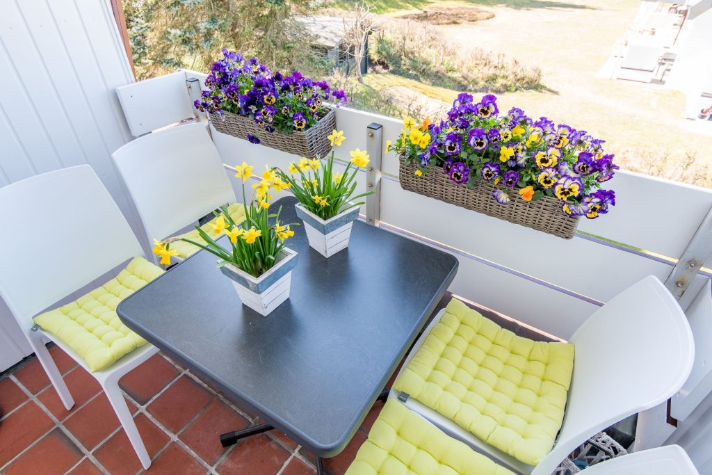 Über eine Balkontür gelangen Sie vom Wohnzimmer aus auf den möblierten West-Balkon, der Platz für zwei Personen bietet. Im darunter liegenden Garten befindet sich eine Sonnenkuhle mit Ganzjahresstrandkorb.