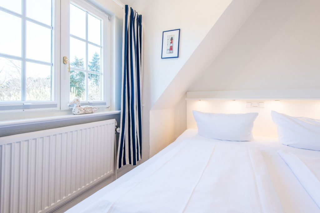 Schlafzimmer 1: Doppelbett, Einbauschrank und Fenster.