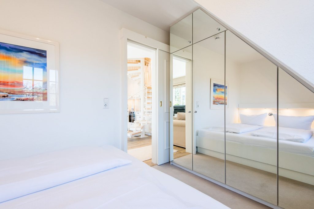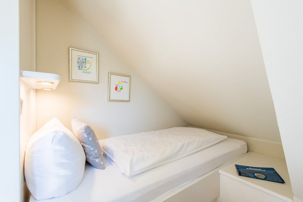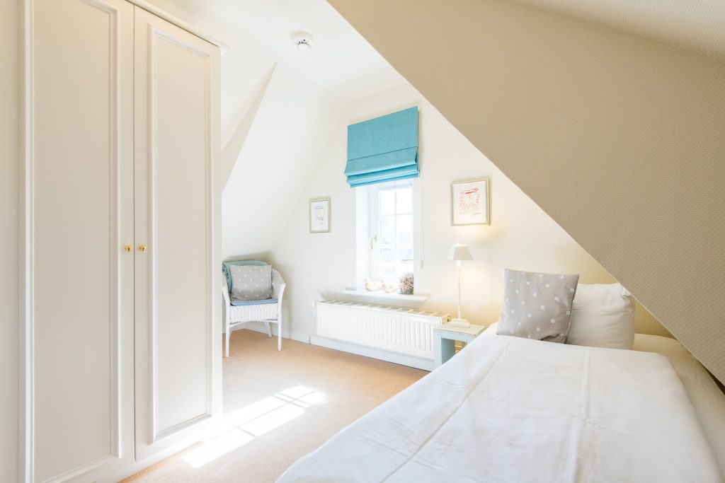 Schlafzimmer 2: Zwei Einzelbetten für Kinder unter Dachschrägen, Kleiderschrank und Fenster.