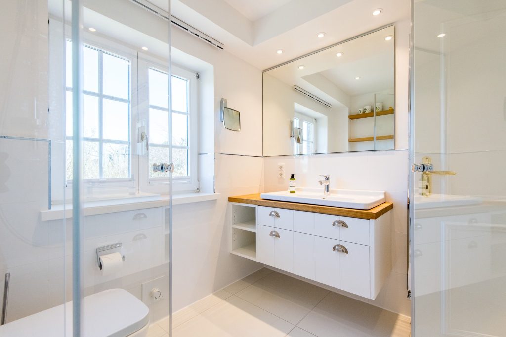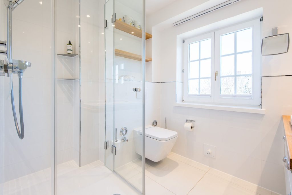 Badezimmer: Helles und modernes Bad mit Fußbodenheizung, bodentiefer Dusche, Handtuchtrockner und Fenster.