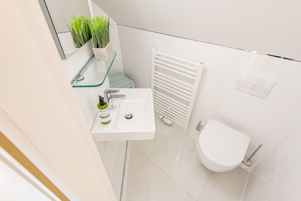 Gäste WC: Kleines und modernes Bad mit Fußbodenheizung, WC und Handtuchtrockner.