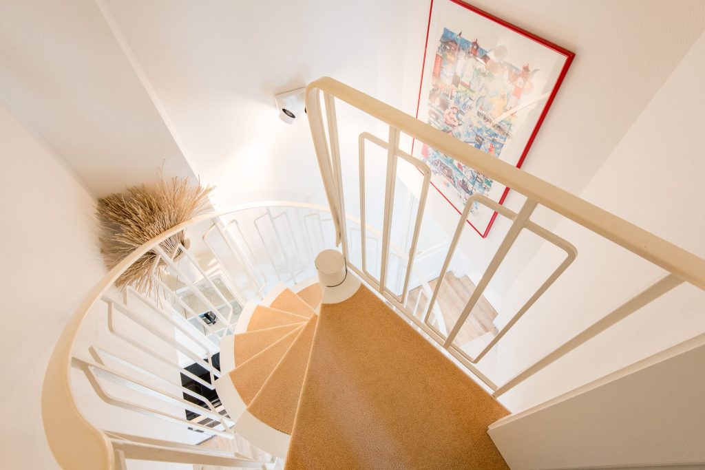 Eine Wendeltreppe mit Treppengeländer führt in das Dachgeschoss:
