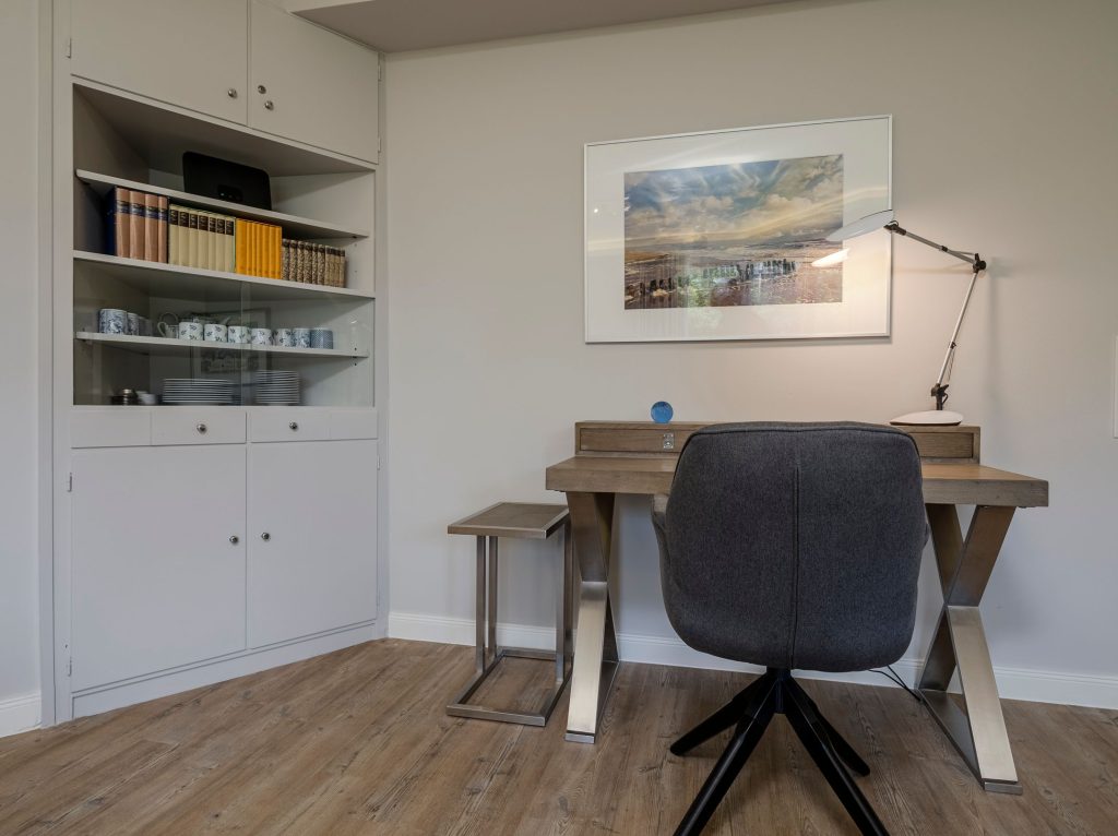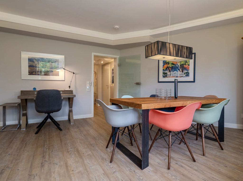 Wohn-/Koch-/Essbereich: Geräumiger Wohnraum mit einer gemütlichen Sofaecke, TV und hervorragend eingerichtetem Arbeitsplatzbereich, der auch das mobile Arbeiten im Urlaub ermöglicht. Der große Essbereich bietet Sitzplatz für sechs Personen und lädt zu geselligen Mahlzeiten ein. Von hier gelangen Sie in die gut ausgestattete Küche.