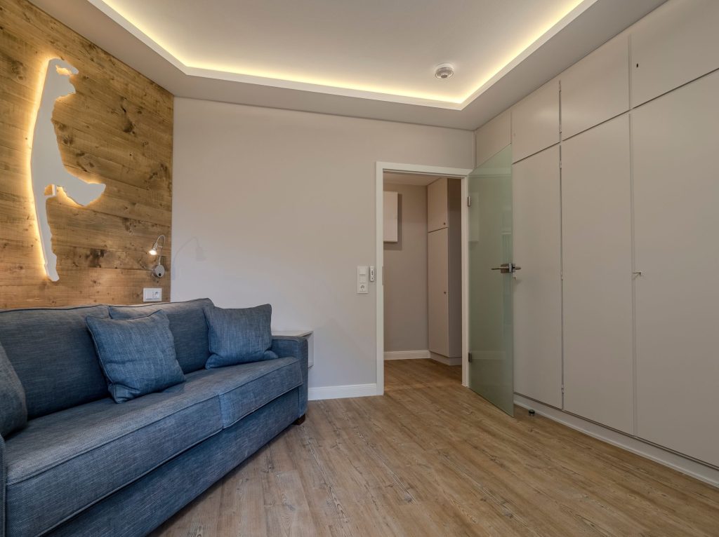 Schlafzimmer 2: Hochwertiges Schlafsofa für zwei Personen, TV und weiterem Arbeitsplatz, der das mobile Arbeiten im Urlaub ermöglicht.