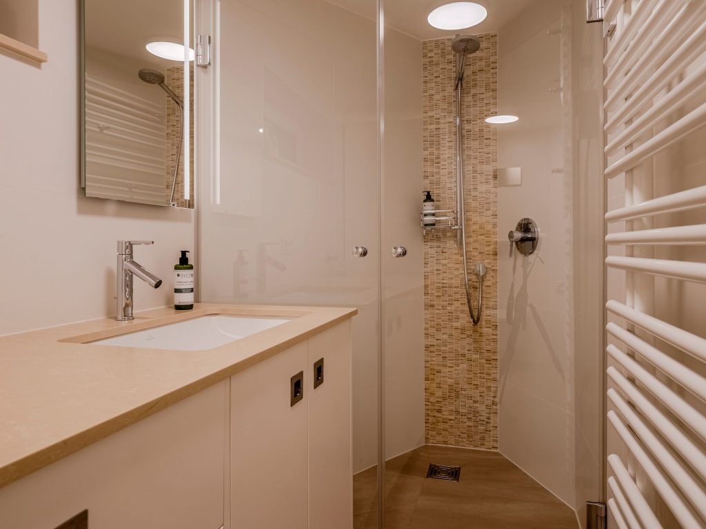 Über eine Treppe gelangen Sie nach unten ins Gartengeschoss des Kamperhofs. Im Wohnungsflur befindet sich eine Garderobe....