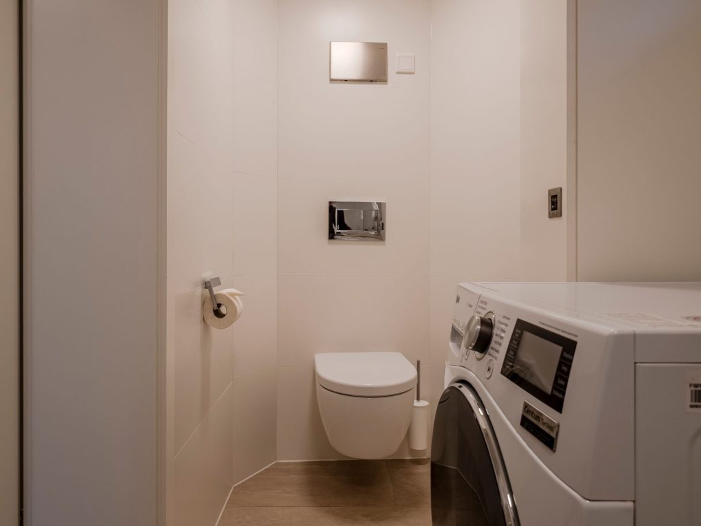 Badezimmer: Bad mit bodentiefer Dusche, WC, Handtuchhalter, Waschtrockner und Fenster.