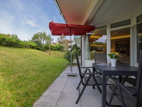 Von diesem Raum aus gelangen Sie auf die halbüberdachte und somit geschützte Terrasse mit Nord-West-Ausrichtung und kleinem angrenzenden Garten, wo Sie in den Nachmittagsstunden die Sonne genießen können. Die möblierte Terrasse bietet Sitzplatz für vier Personen.