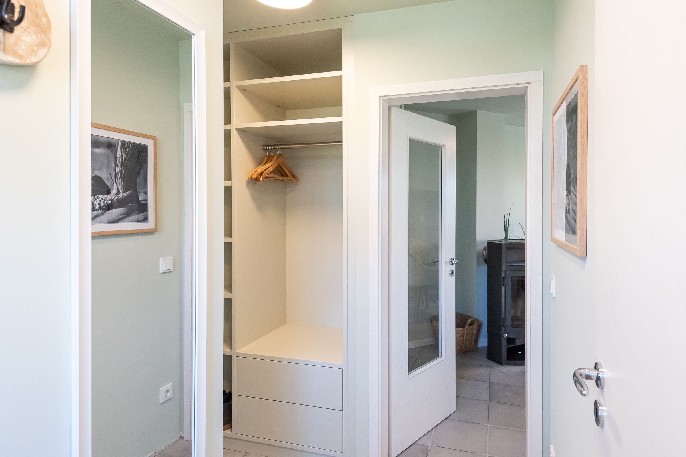 Über eine Treppe erreichen Sie das Untergeschoss und einen Flur mit weiterem Stauraum: